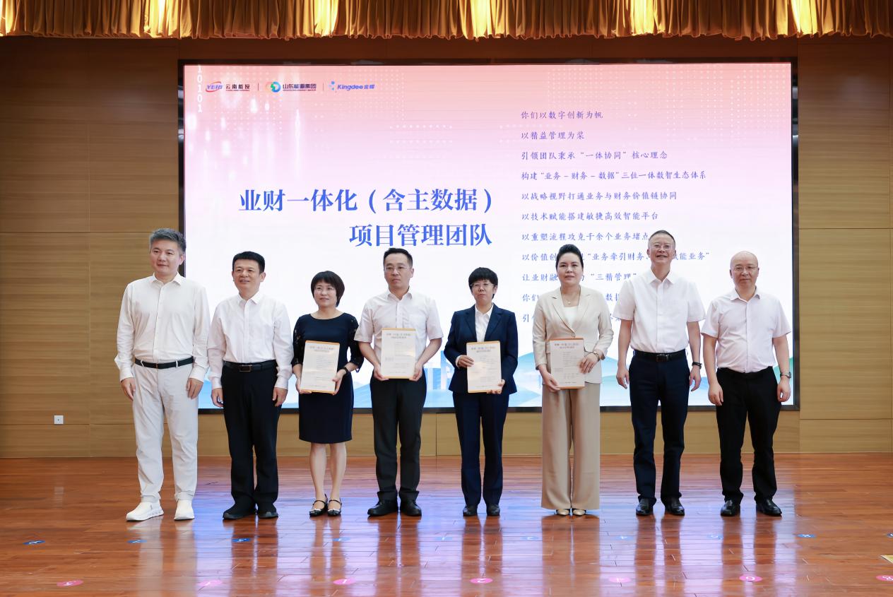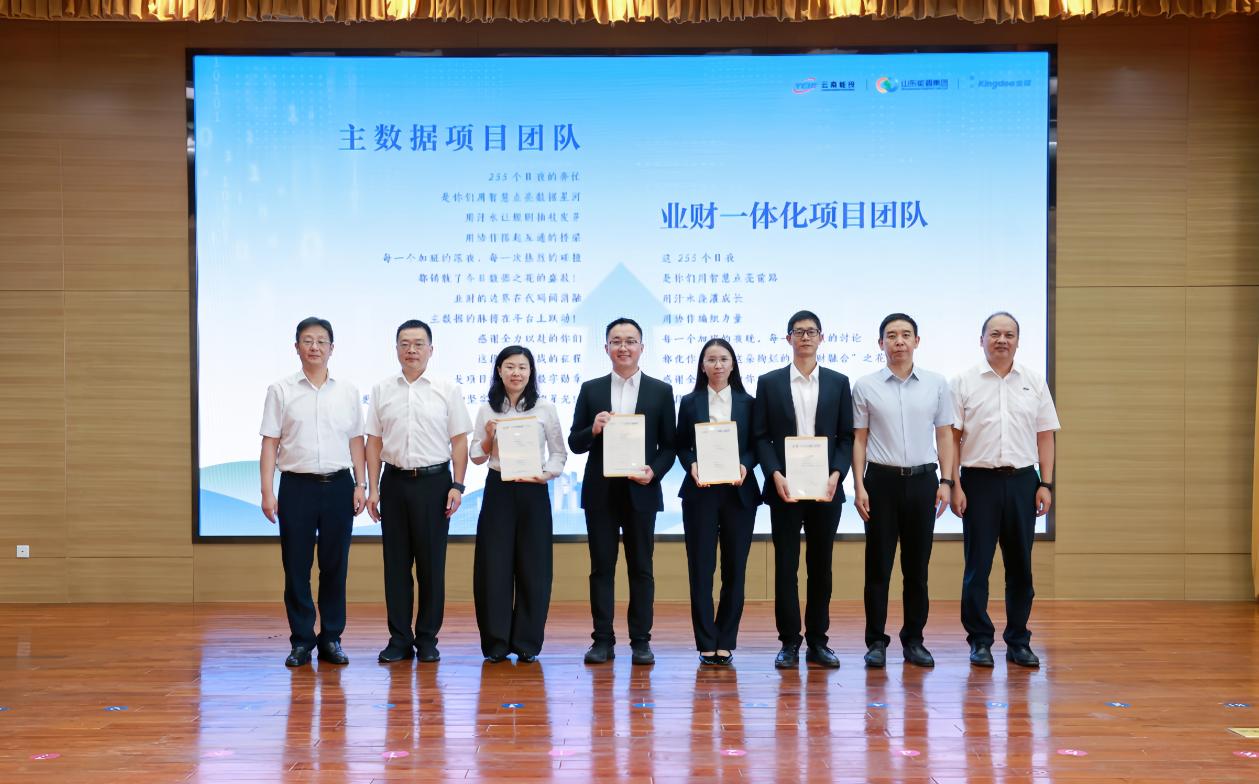 上线仪式上,战略合作伙伴山东能源集团党委副书记、总经理周鸿,金蝶集团总裁章勇分别致辞,热烈祝贺项目成功上线,并表达深化战略协作、共建数字生态的坚定决心。能投集团总裁谢一华在致辞中深刻阐述项目对深化国企改革、提升治理效能的关键作用,对全体项目人员的辛勤付出给予了充分肯定。仪式设置表彰环节,能投集团、煤炭产业集团党委书记、董事长胡均等领导为贡献突出的12个核心团队代表颁发荣誉牌,集团财务总监沈军主持上线仪式并作项目说明。